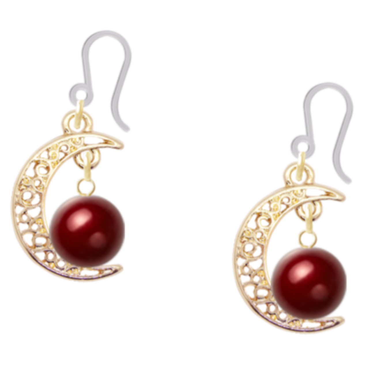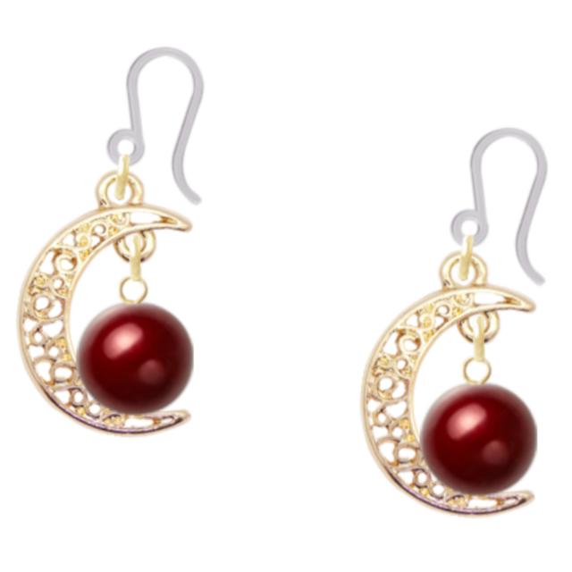 三日月にアメリカンチェリー色の 8㎜樹脂パールを樹脂フックピアスで つくりました。